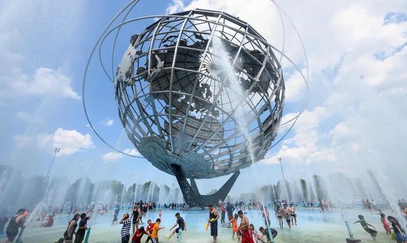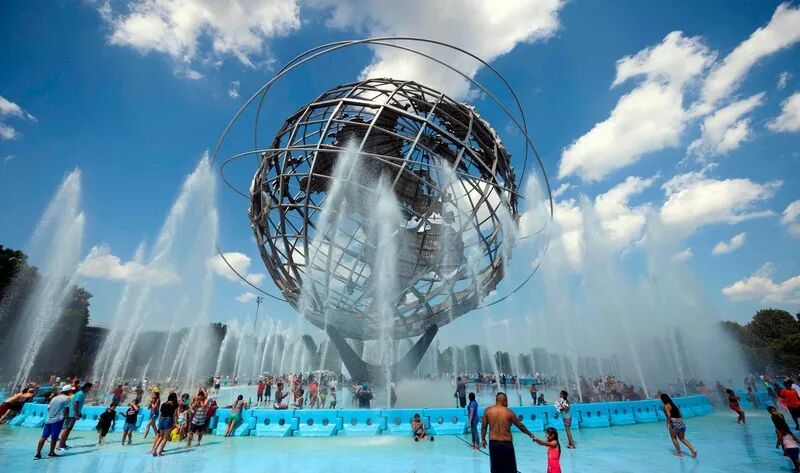 巨型地球仪喷泉高140英尺,重70万磅,直径120英尺,是世界上最大的地球仪建筑。它是为1964年纽约世界博览会而打造的,代表着“人类在不断缩小的地球与不断膨胀的宇宙中所取得的成就”,传达了太空时代即将由此拉开序幕的信号。